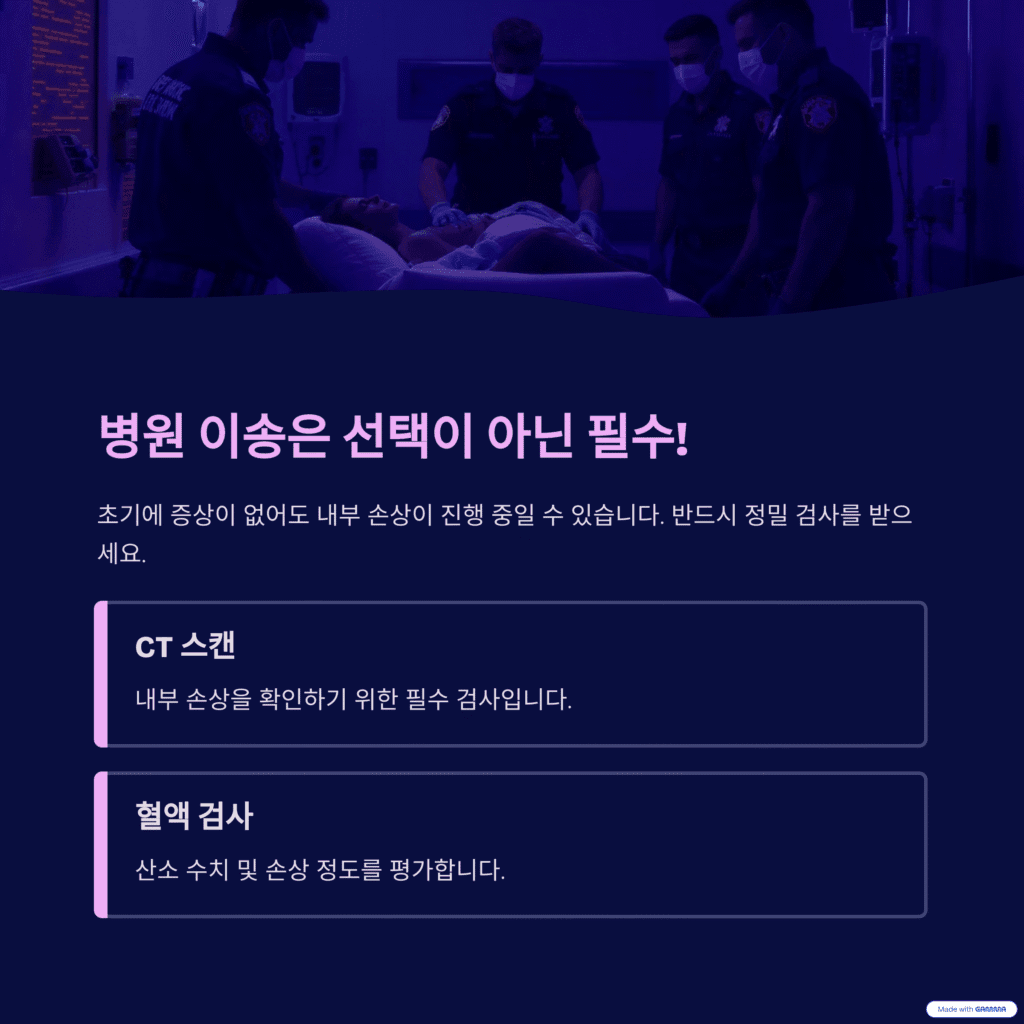 환자를 이동시키기 전에는 반드시 목과 척추를 단단히 지지하고, 전문 의료진의 지시를 따르는 것이 중요해요.